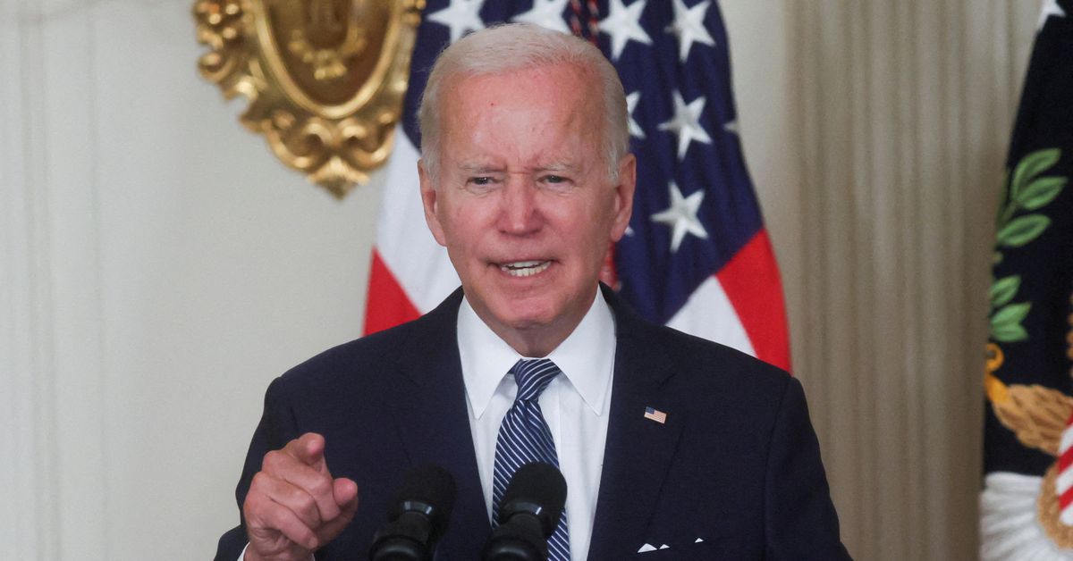 U.S. President Joe Biden speaks during a bill signing ceremony in the State Dining Room of the White House in...